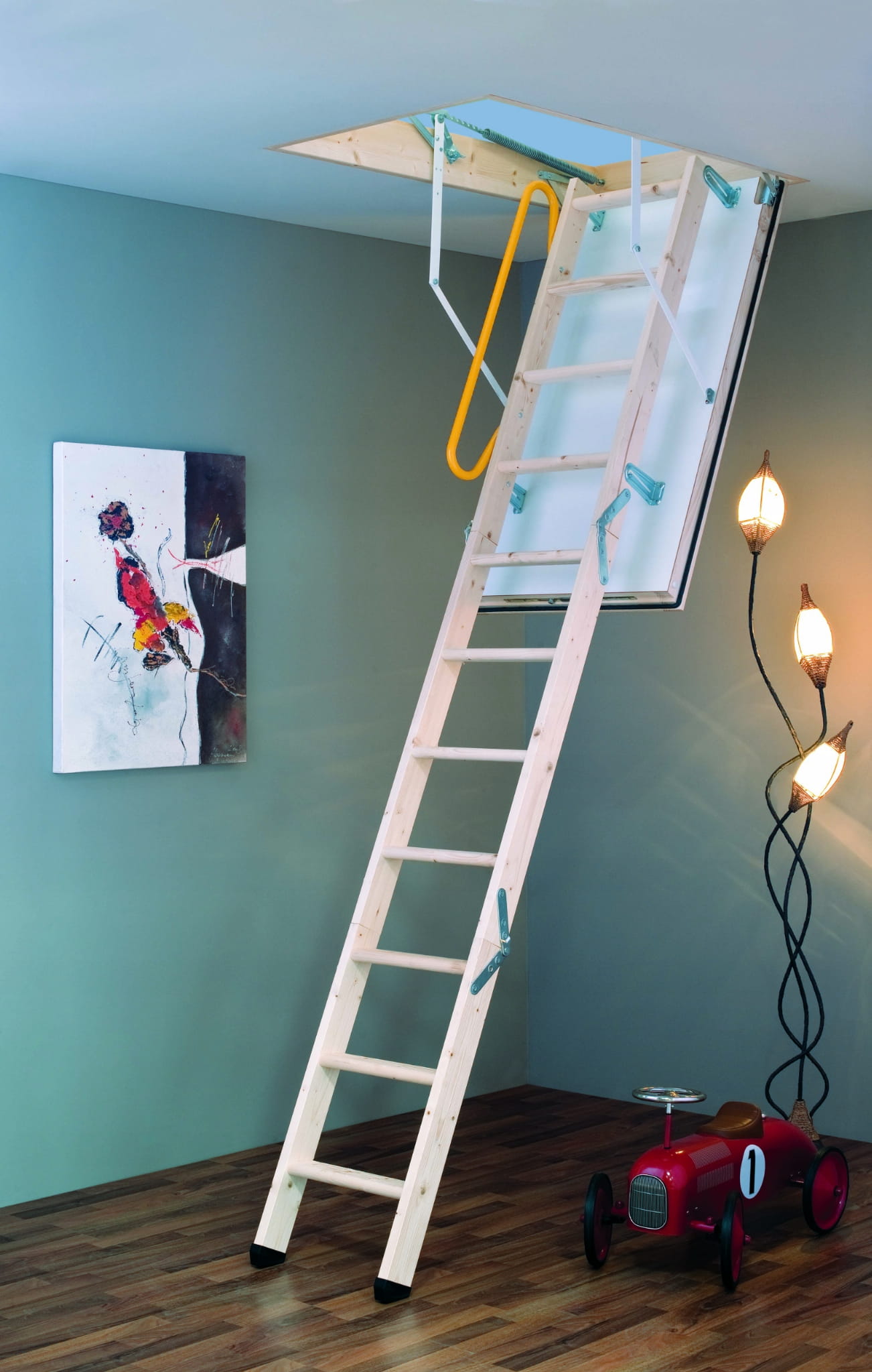 Schody strychowe drewnianą drabinką o współczynniku przenikania ciepła 0,645 W/m2*K i klapie o grubości 60 mm.