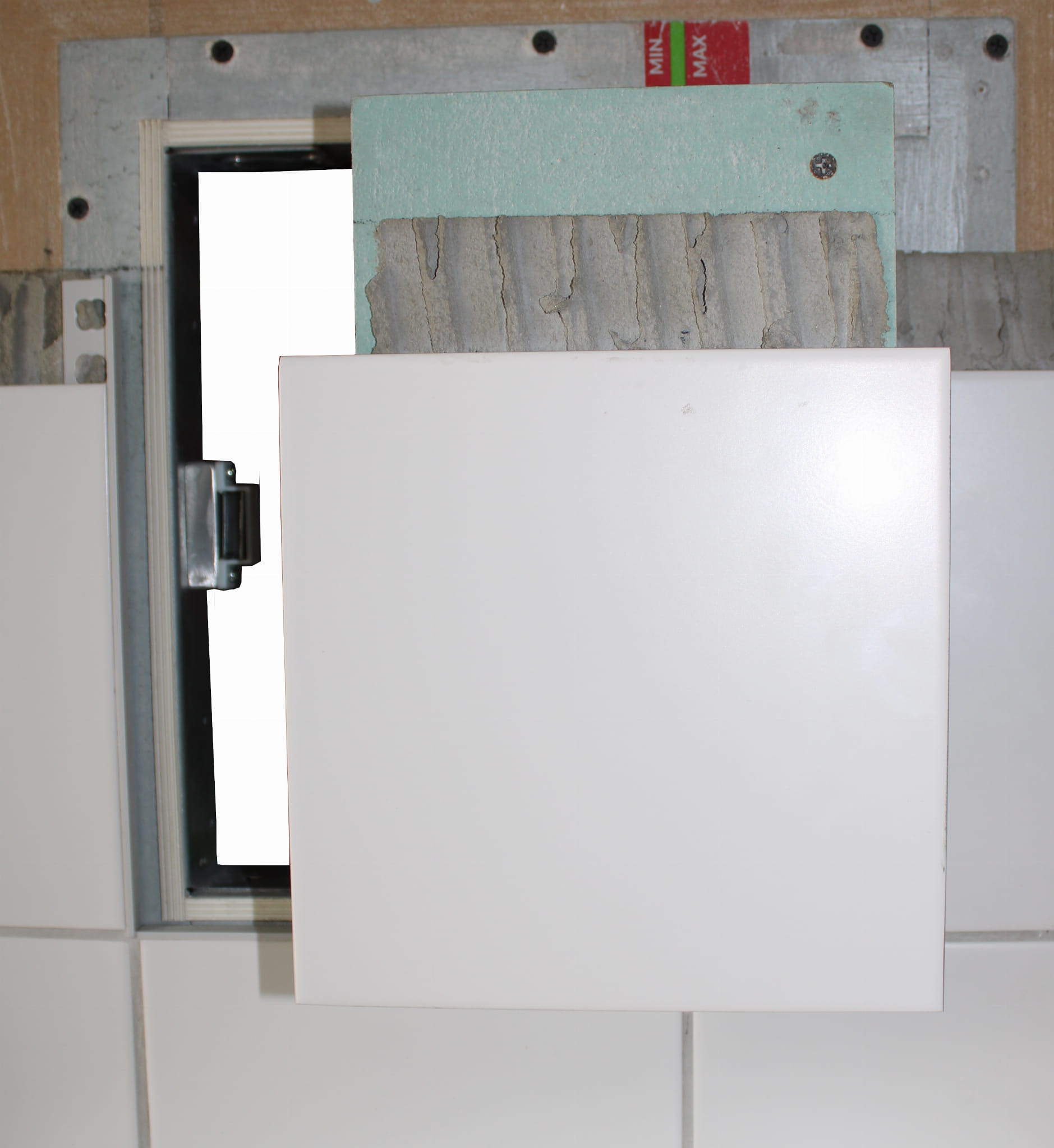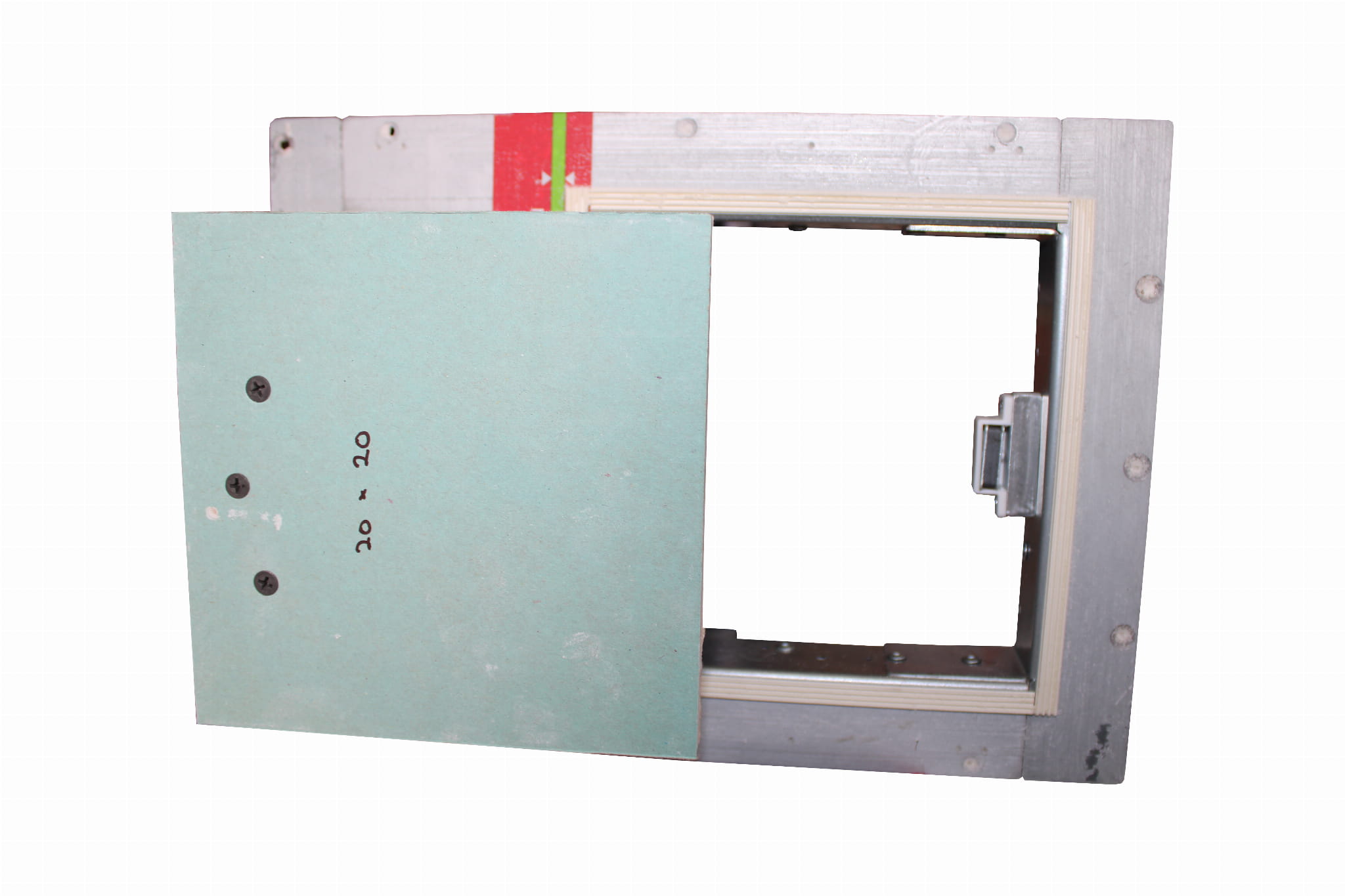 Skrzydło drzwi w tym rozwiązaniu wykonane jest z zielonej płyty kartonowo-gipsowej, a masywny podwójny zawias ze stali o grubości 4mm przez co drzwiczki są masywne.