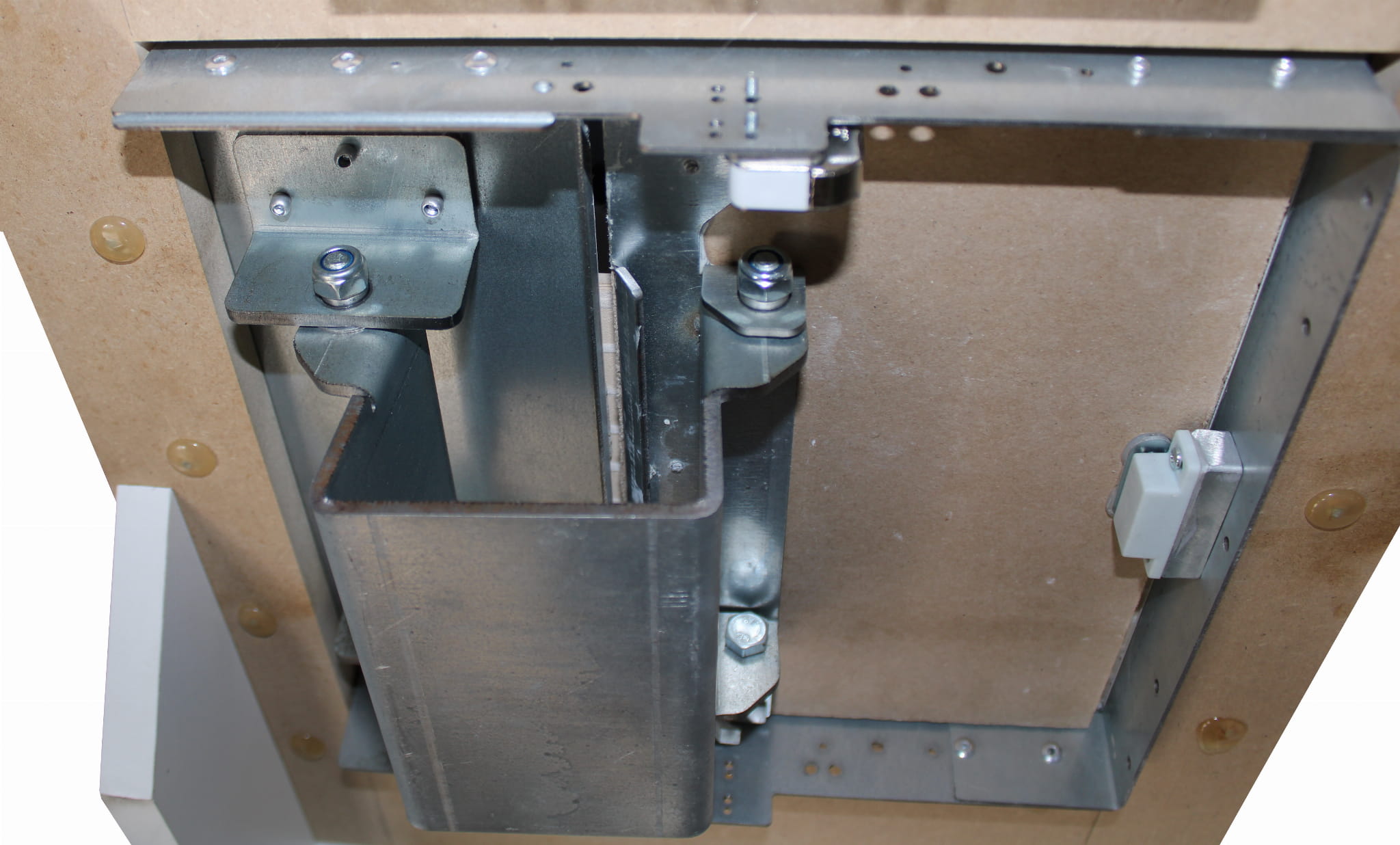 Skrzydło drzwi w tym rozwiązaniu wykonane jest z zielonej płyty kartonowo-gipsowej, a masywny podwójny zawias ze stali o grubości 4mm przez co drzwiczki są masywne.