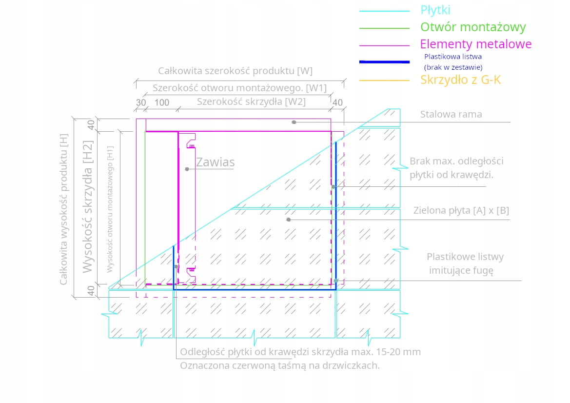 Skrzydło drzwi w tym rozwiązaniu wykonane jest z zielonej płyty kartonowo-gipsowej, a masywny podwójny zawias ze stali o grubości 4mm przez co drzwiczki są masywne.
