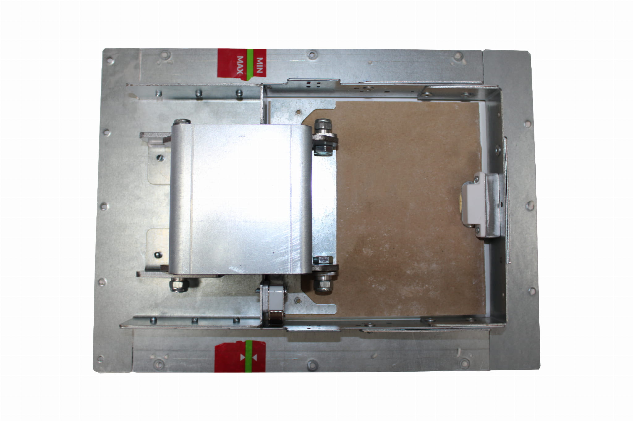 Skrzydło drzwi w tym rozwiązaniu wykonane jest z zielonej płyty kartonowo-gipsowej, a masywny podwójny zawias ze stali o grubości 4mm przez co drzwiczki są masywne.