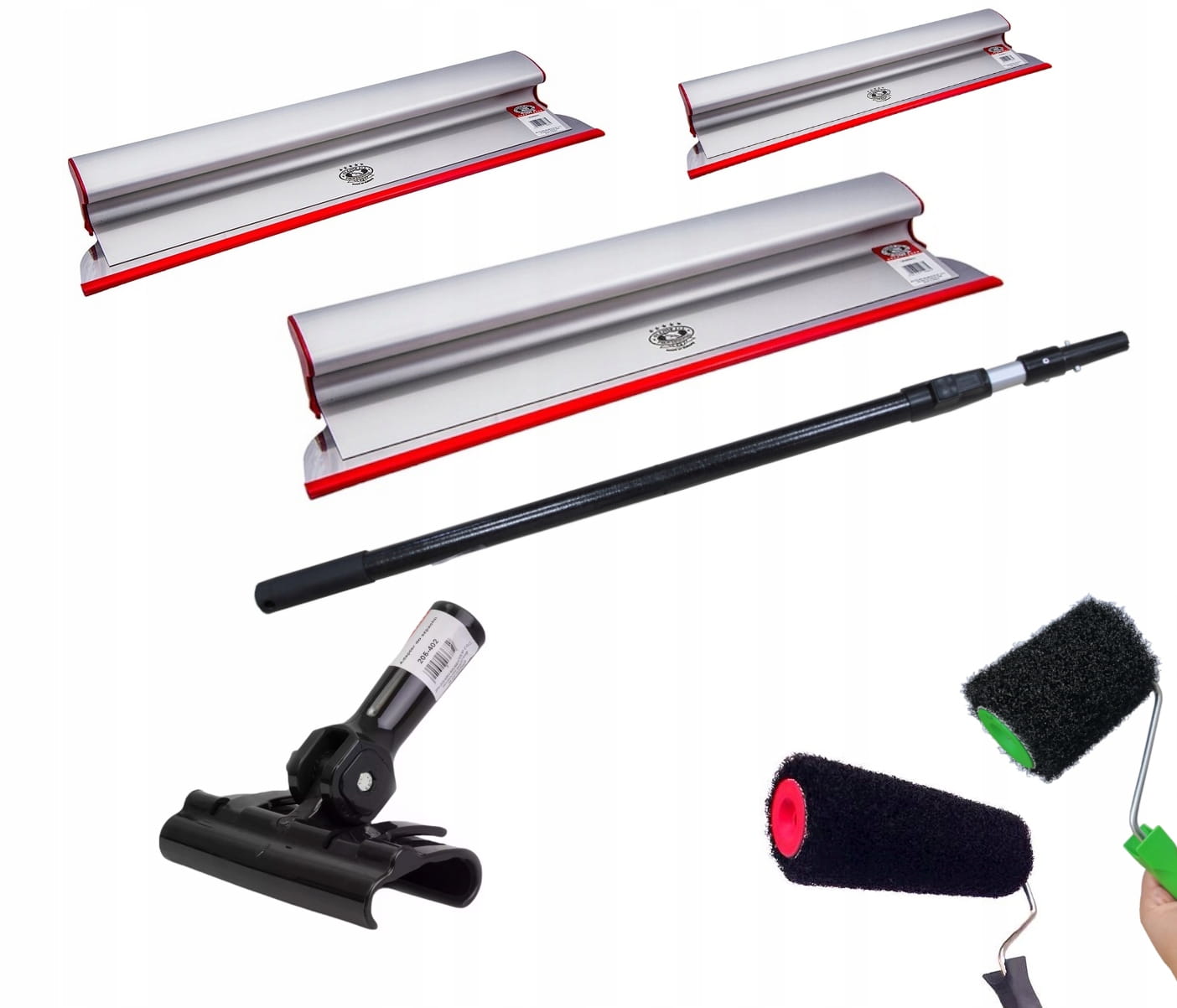 3 x Szpachla powierzchniowa o grubości ostrza 0,3 mm * długość- 80 cm * długość- 60 cm * długość - 40 cm 1 x Kij teleskopowy 1 x Adapter łączący szpachlę z teleskopem 1 x Wałek do gładzi 10 cm 1 x Wałek do gładzi 23 cm